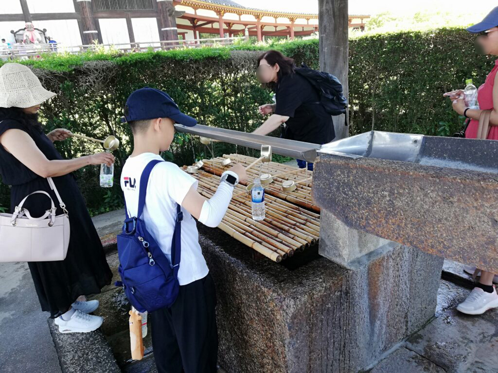 前庭の右手にある手水舎で手を浄めさせてもらう。外国人観光客の姿もたくさん見受けられる。