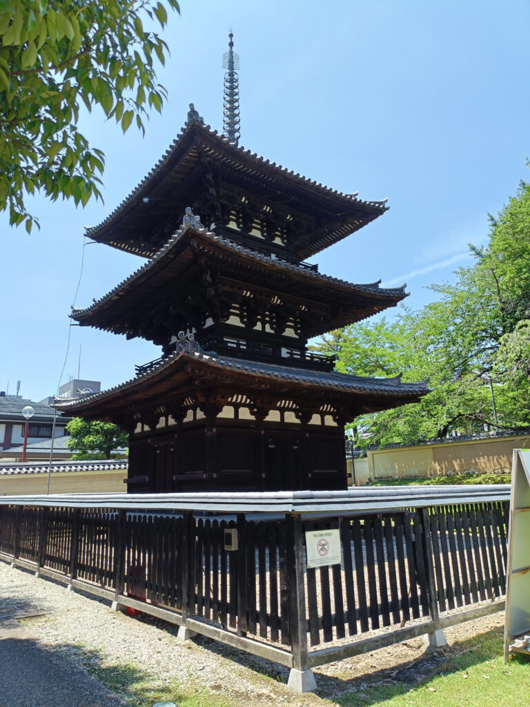 不動堂の対面方向にあるのが「三重塔」です。高さが約19メートル、初層幅が約4.8メートル。北円堂と並んで興福寺最古の建物のひとつとされ、その繊細な木割りと軽やかな屋根の重なりが、どこか女性的で優美な印象を与えます。