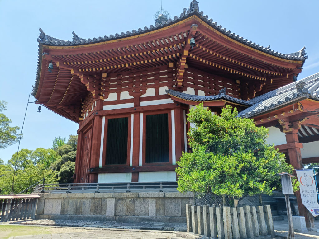たび重なる焼失と再建を経て、現在の建物は室町時代の応永22年(1415年)に再建されたものだそうです。寄棟造・本瓦葺の堂は、唐招提寺金堂を参考にしたとされる天平様式で、組物に三手先斗栱(みてさきときょう)を多用するなど、創建時代の雰囲気をよく伝えています。正面約25.6メートル、側面約14.1メートルの堂々たる規模を誇り、その静かな美しさは訪れる人の心を惹きつけます。