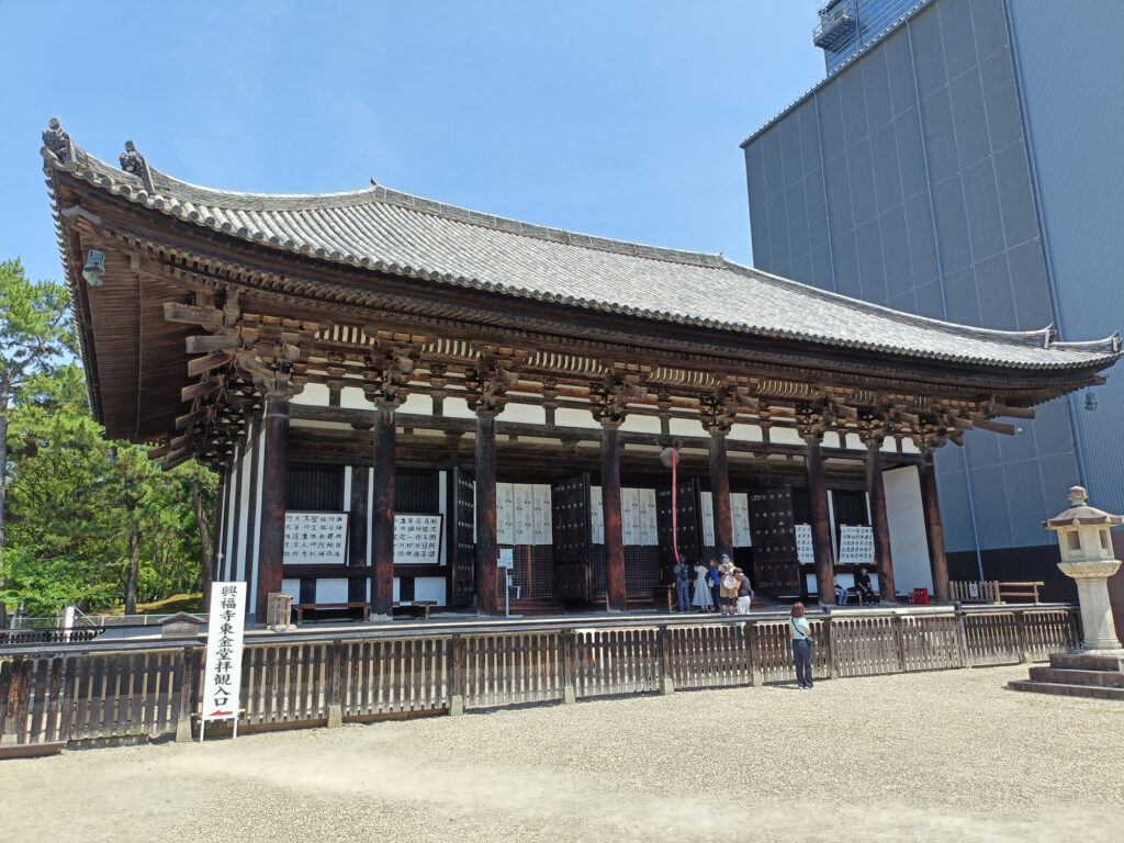 北円堂から東に向かうと、右手に大きな「中金堂」が見えてきます。興福寺の中でも有名な五重塔が現在修復中なので、現在はこちらの中金堂が興福寺のランドマーク的存在を担っていると言えます。