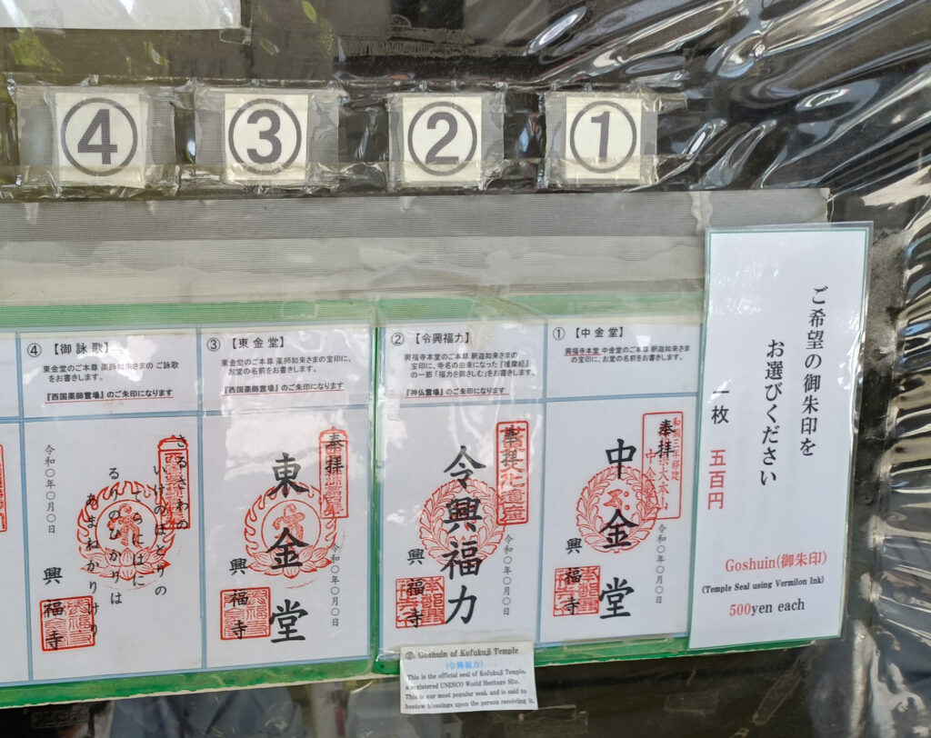 南円堂の右手に御朱印授与所があります。西国三十三所観音霊場9番札所と共用になっていますので、メニューがたくさんありますが、興福寺の御朱印は500円となっています。