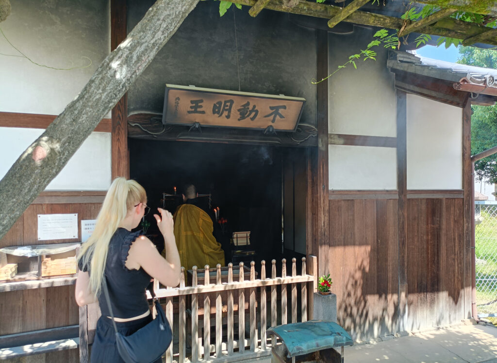 階段を登ると御香の良い香りが漂ってきました。「不動堂」が右手にあり、住職が護摩焚を行っていました。堂内の壁や仏像の燻み具合から、頻繁に護摩焚きがされているようですね。