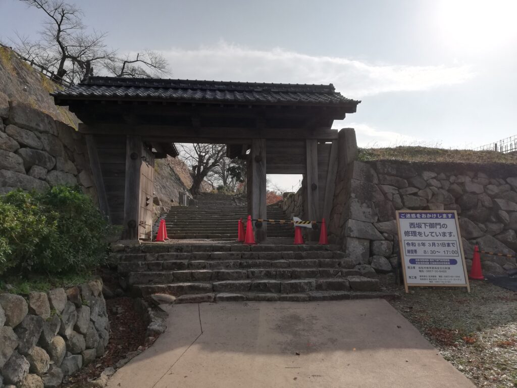 御城印をいただき、いよいよ鳥取城跡を登っていく。城代屋敷跡の脇から石段を上がり、右へ折れた先に姿を現す「西坂下御門(中仕切門)」から入る。