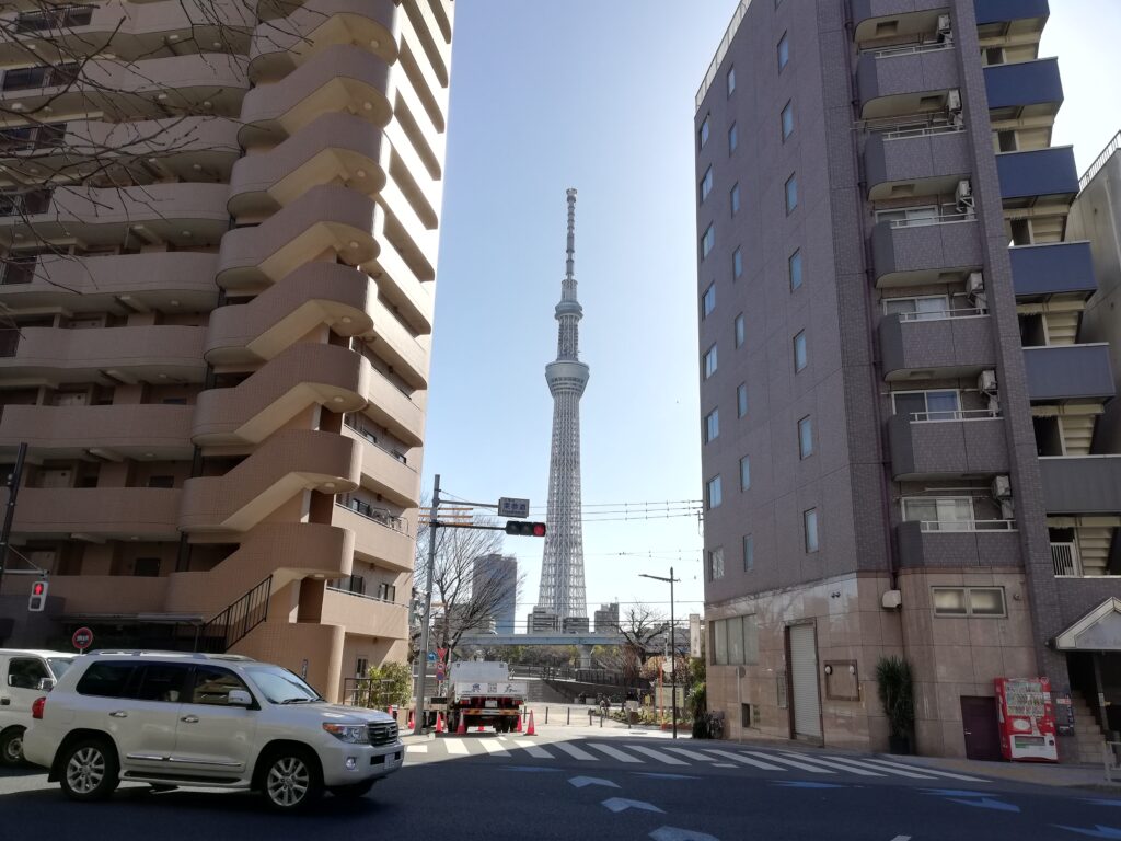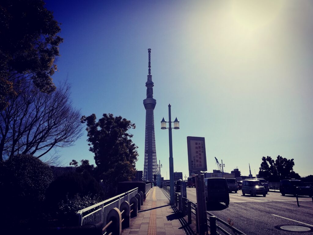 しばらく歩いていると、右手のビルの隙間からふとスカイツリーが顔をのぞかせた。朝の光を受けながら空に伸びる姿がなんとも美しい。思いがけず東京らしい景色に出会えて、ちょっと得をした気分だ。