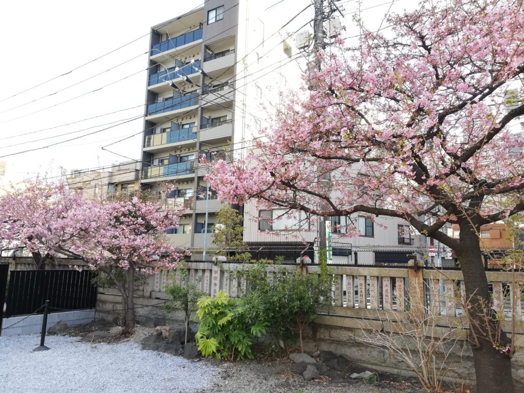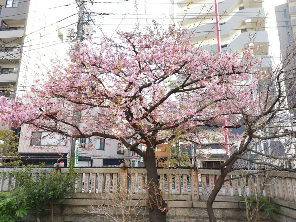 この日は2月18日、境内には濃いピンク色の川津桜が美しく咲いていた。