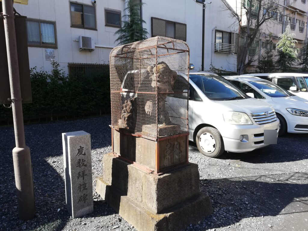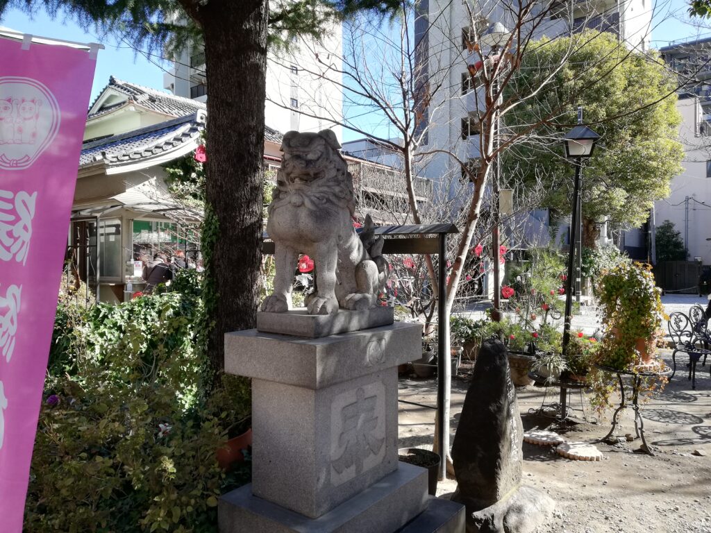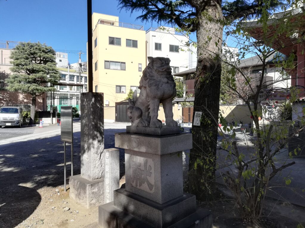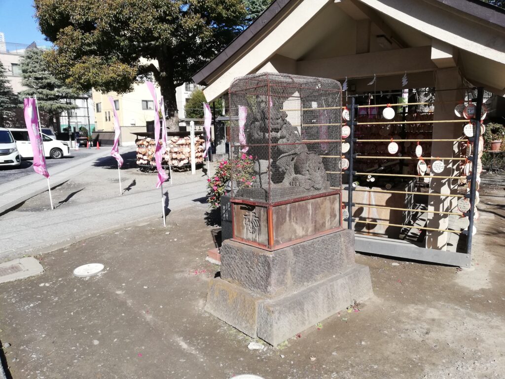 境内の一角には、金網の籠で覆われた石造の狛犬が置かれている。この狛犬は宝暦2年(1752)、当時この地の鎮守であった今戸八幡神社(現在の今戸神社)に、今戸焼の職人たちによって寄進されたもので、さらに文政5年(1822年)8月に再興されたと伝えられている。製作を手掛けたのは浅草新堀の石工・小松屋竹右衛門(岡田竹右衛門)。願主として本多五郎兵衛忠廣という人物の名も刻まれているそうだが、詳しいことはわかっていないようだ。